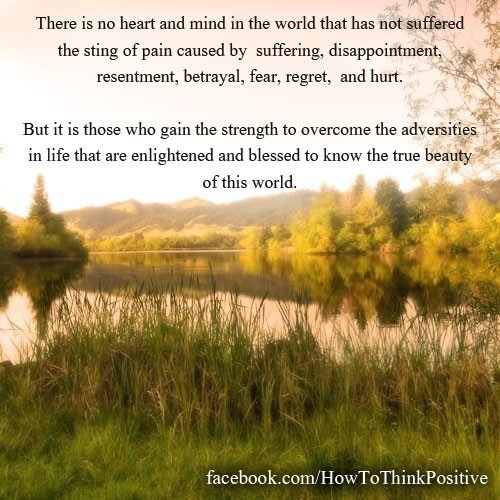 There is no heart and mind in the world that has not gone through the sting of pain caused by suffering, disappointment, resentment, betrayal, fear, regret, and hurt. But it is those who gain the strength to overcome the adversities in life that are enlightened and blessed to know the true beauty of this world.